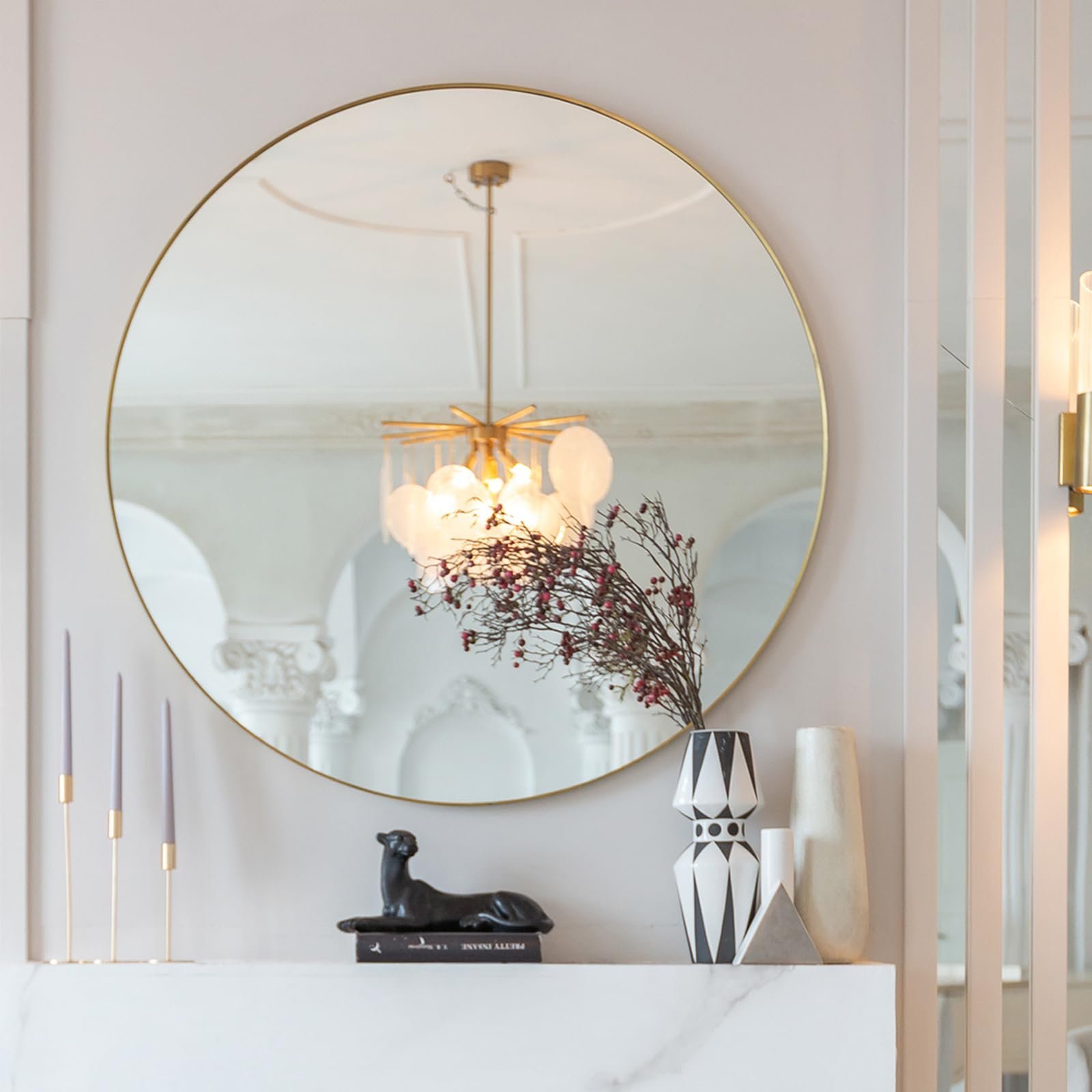 Decorative round mirror with ornate gold border.
