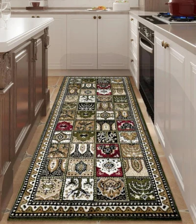 Elegant runner carpet perfect for hallways and narrow spaces. Features green color. Pakistani